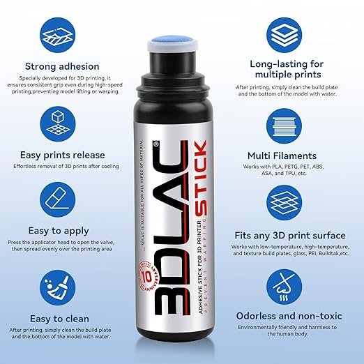 El 3DLAC Stick ofrece fijación legendaria para impresión 3D sin aerosoles. Evita el warping en PLA, PETG y ABS con precisión genial. ¡Cómpralo aquí!