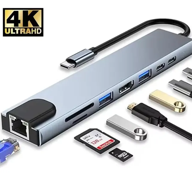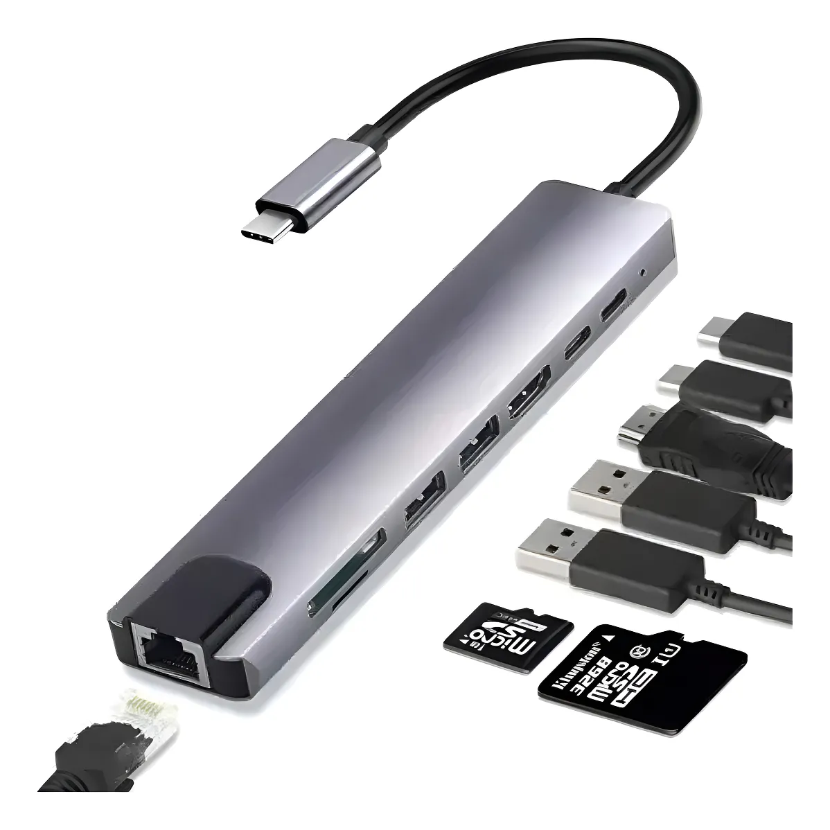 El Hub USB C 8 en 1 expande tu conectividad. Incluye HDMI 4K, Ethernet RJ45 y Carga PD 87W. Carcasa de aluminio elegante. ¡Potencia tu laptop líder aquí!