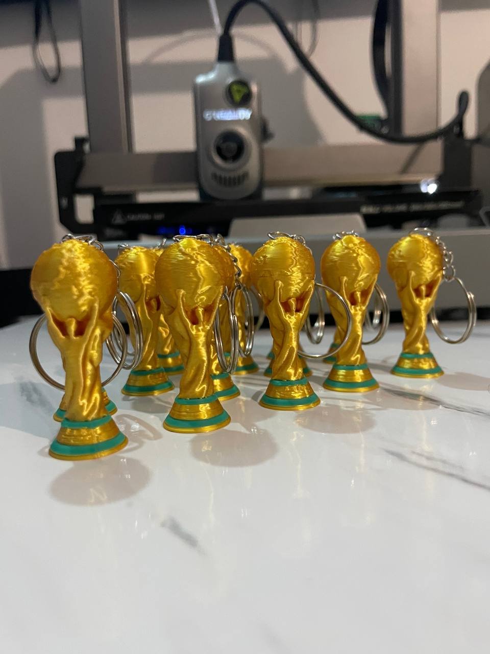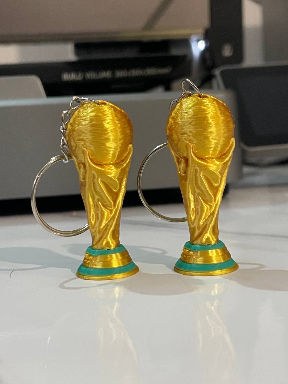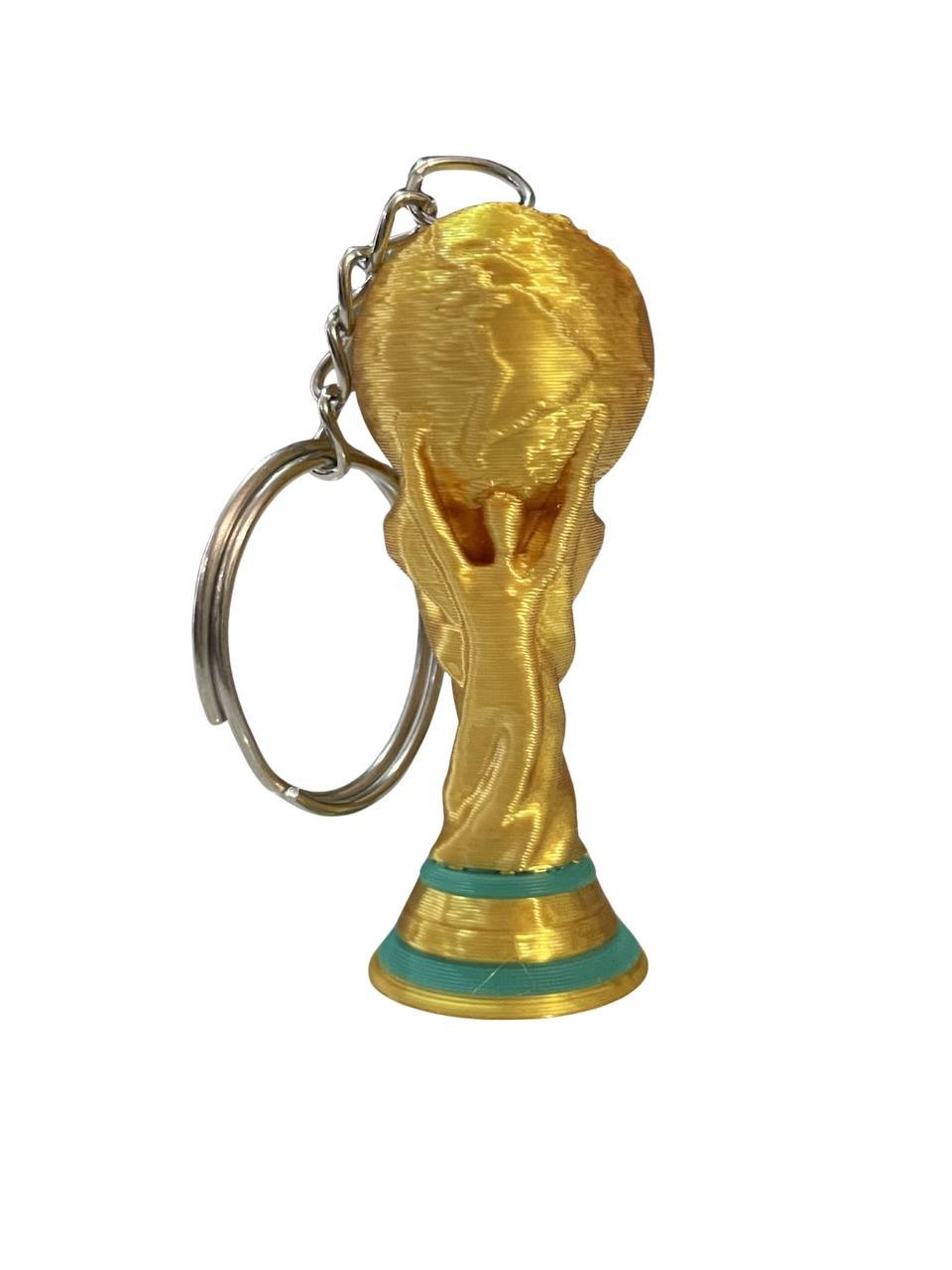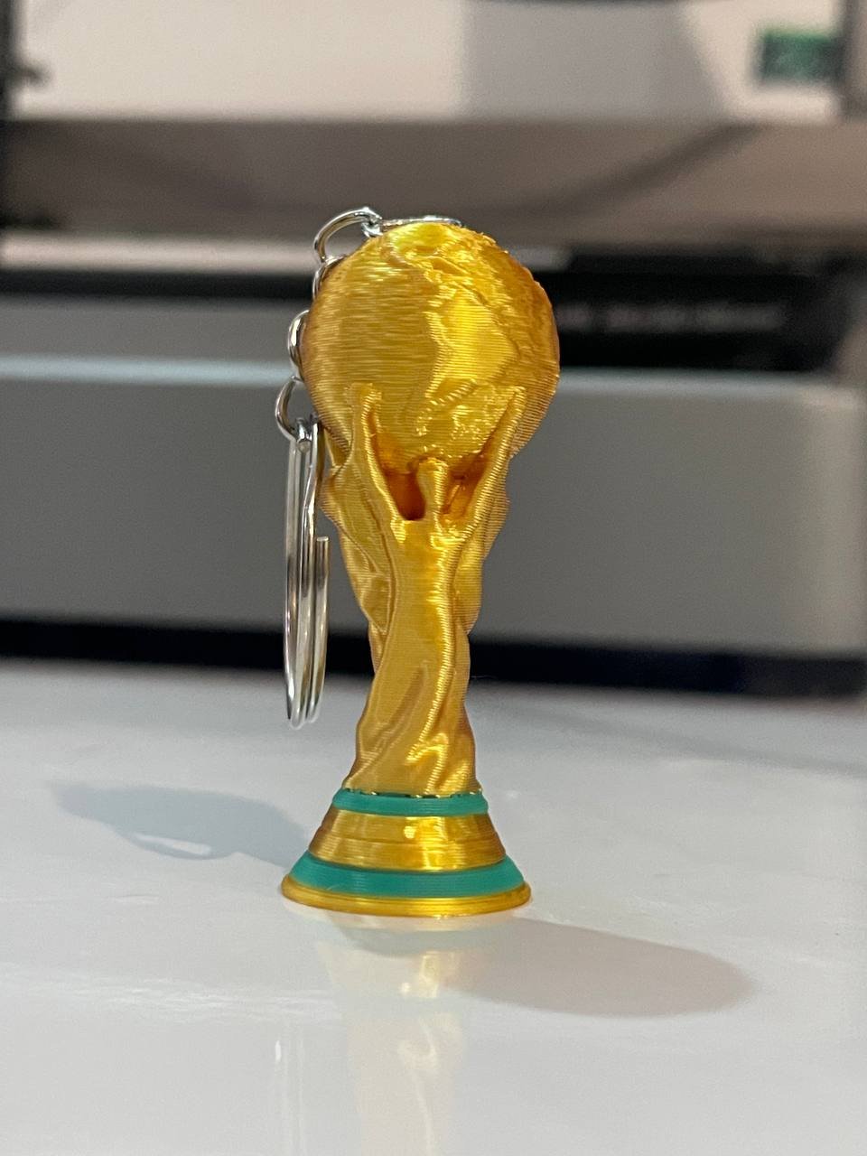 El secreto de su estética premium radica en el material. Este Llavero Mini Copa del Mundo se imprime utilizando filamento Silk Gold PLA de alta calidad, el cual ofrece un acabado oro brillante sedoso que imita perfectamente el brillo del metal precioso.